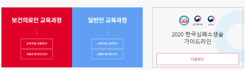 로그인 후, ET-P 교육과정, BLS-Provider 교육과정 [보건의료인 교육과정] > 빨간 배너 [교육과정신청하기] 클릭 ET-S 교육과정, BLS 일반인 교육과정 [일반인 교육과정] > 파란 배너 [교육과정신청하기] 클릭
