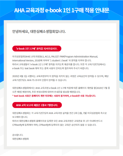 교재 : Korean BLS HCP Provider Manual E Book 필수지참 구매처 : https://www.laerdal.com/kr/item/15-2009 ★ 반드시 교재를 지참하시고 입과 하셔야 합니다. 미국심장협회(AHA) 교육과정(BLS, ACLS, PALS)은 PAM(Program Administration Manual, International Version, 2018)에 의하여 '1 student 1 book' 의 원칙을 지켜야 합니다. 2020년 4월 1일 시행 교육부터 교육생들은 반드시"e-book 1인 1구매"가 원칙입니다. 교육신청시 구매하신 e-book 코드를 반드시 입력 바랍니다. 대한심폐소생협회 "AHA교육과정 e-book 1인 1구매적용 안내문"