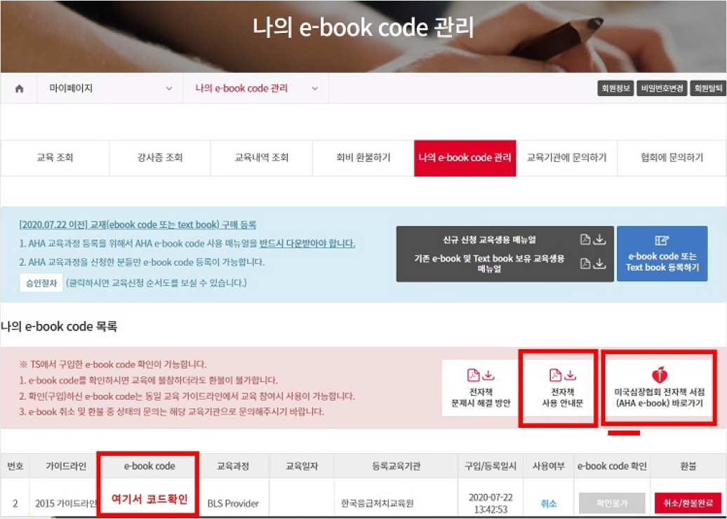 교육비 입금 2~3일후 대한심폐소생협회->마이페이지에서 e-book코드확인가능합니다.