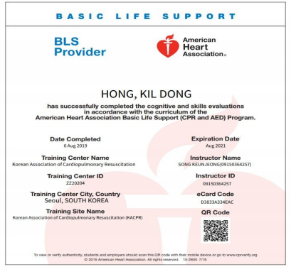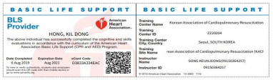 1. 교육 수료 후 합격자에 한하여 이수증 발급 (대한심폐소생협회 및 American Heart Association 미국심장협회)